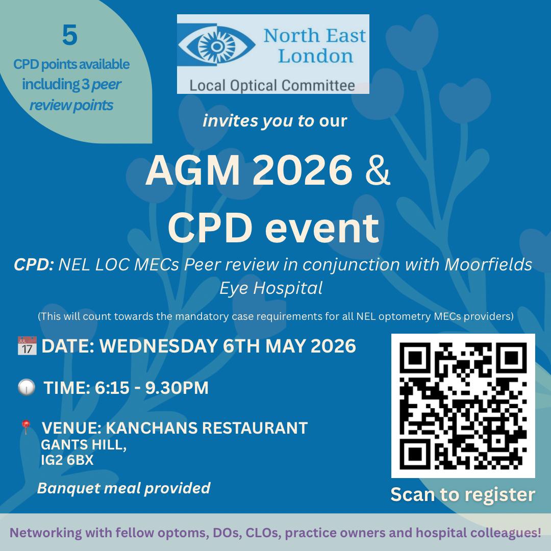 Please note that whilst the CPD event is open to all providers of primary eyecare service in North East London – the AGM is only open to performers and contractors in Barking & Dagenham, Havering, Redbridge & Waltham Forest.